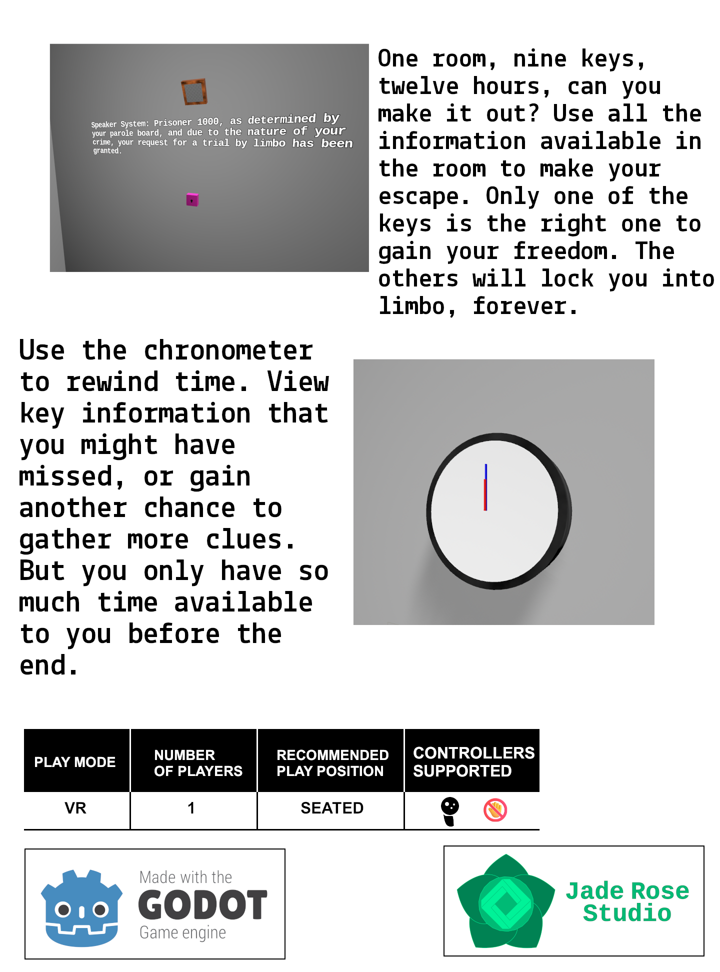 Submission for the 2026 Godot XR game jam. Escaping limbo is a puzzle game where you are given one chance to earn your freedom. Use the clues available throughout the room to select the correct key for your escape, and leverage the power of the room's chronometer to rewind time and gain an advantage.